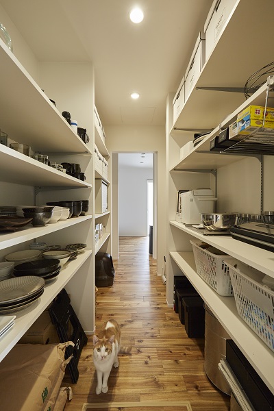 壁の両面にたっぷりと棚を造作したパントリーには、食器や備品の陳列一つひとつに奥様のセンスの良さが光っています。