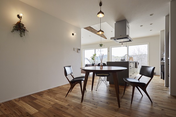 玄関から入るとすぐにダイニングにつながっており、奥に広がる桜の木が見えます。