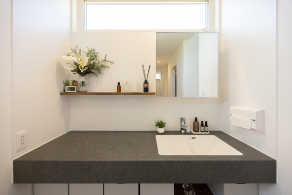 1階の洗面台は、大人2人が並んでもゆとりのある広さで使い勝手がよく、混雑する朝の準備もばたつきません。