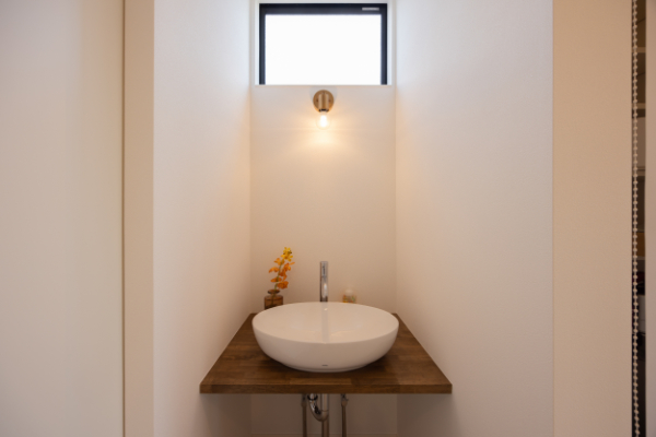 1階とは雰囲気を変え、白い陶器のボウルと照明でホテルライクな印象です。