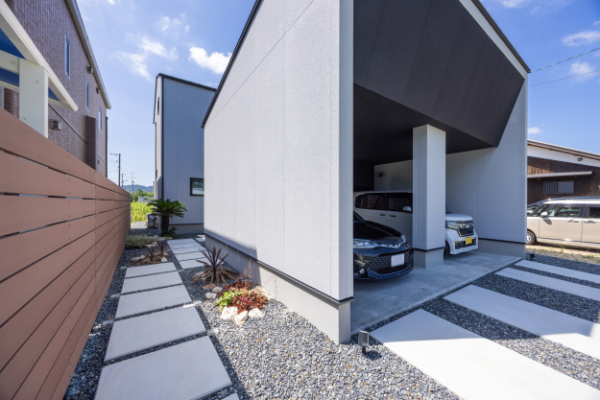 家の正面には存在感のある雨でも濡れずに玄関までたどり着く動線が組まれたインナーガレージです。