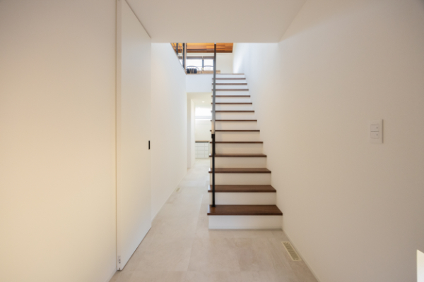 玄関を開けると2階リビングにつながる階段と開放感のある吹抜けになっています。