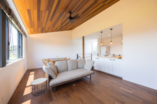 南面に大きな窓を設けることで外からの視線を気にせず自然光をたっぷり採り込め、明るく開放的な空間を演出したリゾート気分を満喫できるリビングです。