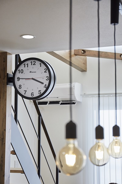 存在感のある時計を目印に、ダイニングが家族の集まる憩いの場です。