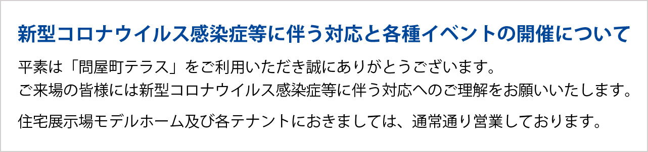 [住宅展示場] 住まいの夢が詰まった、全9棟の住宅展示場をご覧いただけます。 [クリニック&保育園] 産婦人科のクリニックと 保育園。笑顔の似合う街と人を育みます。 お買い物からお食事まで、様々なジャンルの素敵なお店が揃っています。 [問屋町内周辺店舗のご紹介] 問屋町テラス周辺の店舗をご紹介しています。 問屋町テラスに来られた際は、ぜひ周辺のお店も一緒に お楽しみください。 イベント出店などのお問い合わせ ぜひぜひ自由な発想でいろいろなイベントに使ってください! 他にも「こんなことやりたいんだけど、できるかな?」と思われたら、まずはお気軽にご相談ください! 住所:700-0977 岡山県岡山市北区問屋町15-101