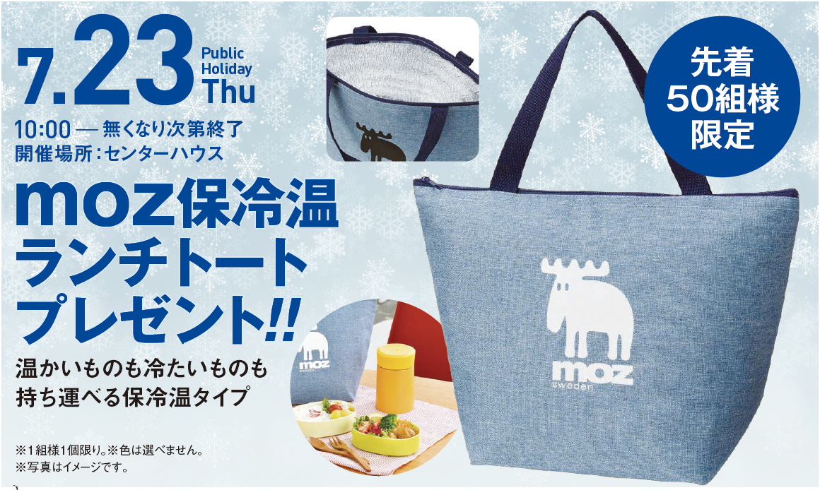 EVENT 2020.07.21 【サマーフェア】moz保冷温ランチトートプレゼント!!先着50組様限定 日 時 7/23(木) 10:00 〜 無くなり次第終了 開催場所 問屋町テラス内センターハウス 内 容 先着50組様限定 moz保冷温ランチトートプレゼント! 温かいものも冷たいものも持ち運べる保冷温タイプ ※1組様1個限り。 ※色は選べません。 ※写真はイメージです。