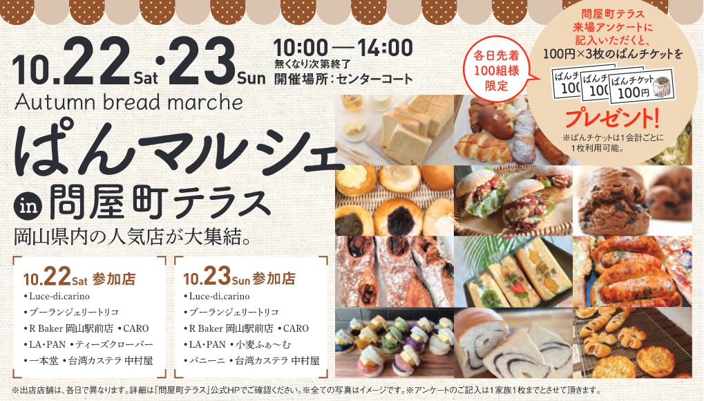 | 出店店舗 | 22日(土) •Luce-di.carino •ブーランジェリートリコ •R Baker 岡山駅前店 •CARO •LA・PAN •ティーズクローバー •一本堂 •台湾カステラ 中村屋 23日(日) •Luce-di.carino •ブーランジェリートリコ •R Baker 岡山駅前店 •CARO •LA・PAN •小麦ふぁ~む •パニーニ •台湾カステラ 中村 |