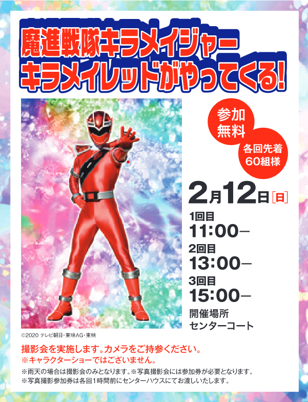 | 注意事項 | ※キャラクターショーではございません。 ※写真撮影会には参加券が必要となります。 ※写真撮影参加券はセンターハウスにてお渡しいたします。 |