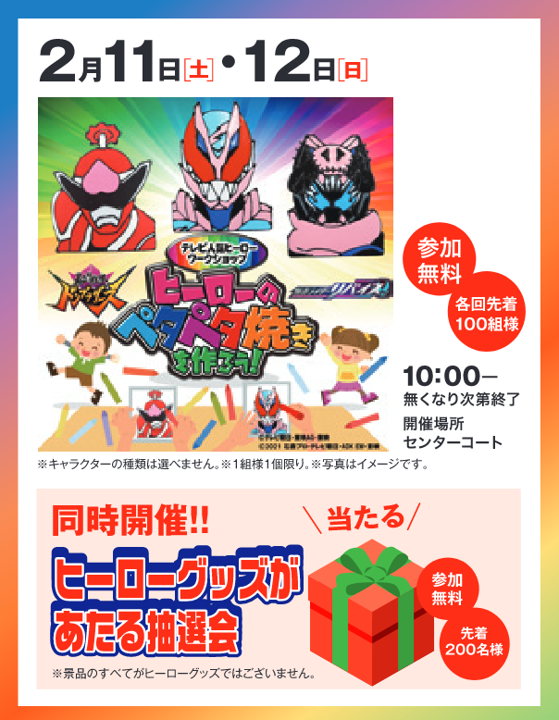 | 内 容 | 各回先着60組様 観覧無料 1回目:11:00〜 2回目:13:00〜 3回目:15:00〜 ※ヒーローペタペタ焼きは先着100組様限定となります。各回ではございません。 |