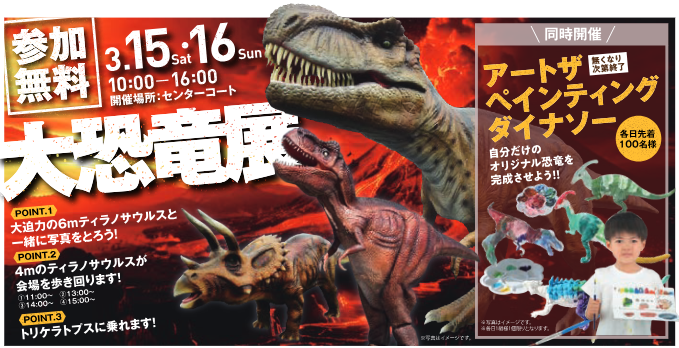 | 内 容 | 【Point.1】大迫力の6mティラノサウルと一緒に写真をとろう! 【Point2】4mのティラノサウルが会場を歩き回ります! ※11時~ 13時~ 14時~ 15時~ ※1回/10分程度 【Point3】トリケラトプスに乗れます! |