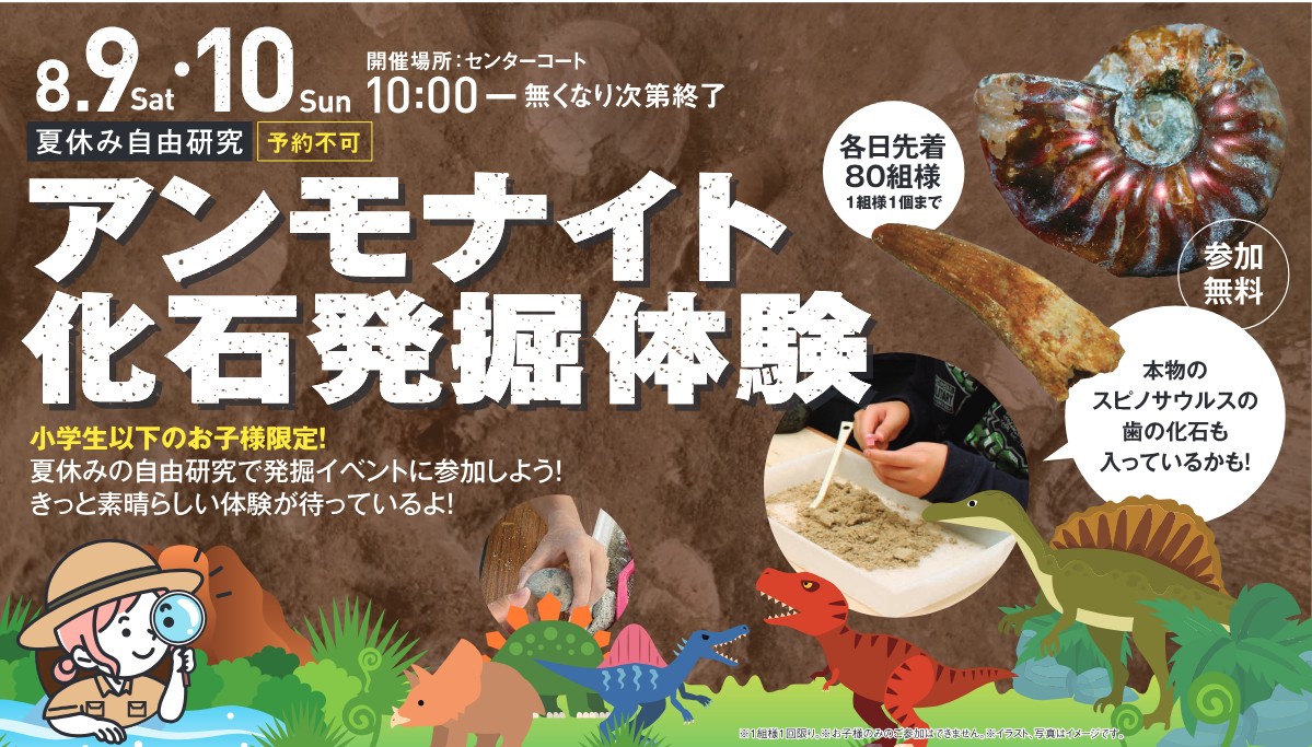 EVENT 2025.08.04 アンモナイト化石発掘体験 夏休み自由研究! 化石ハンターの気持ちになってアンモナイトを発掘してみよう!! 日 時 8/9(土)10(日) 10:00〜無くなり次第終了 各日先着80組様 ※1組様1個まで 開催場所 問屋町テラス内センターコート