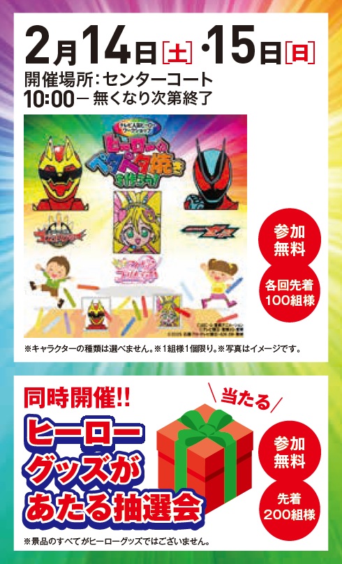 | 内 容 | 各回先着60組様 観覧無料 1回目:11:00〜 2回目:13:00〜 3回目:15:00〜 ※ヒーローペタペタ焼きは先着100組様限定となります。各回ではございません。 |