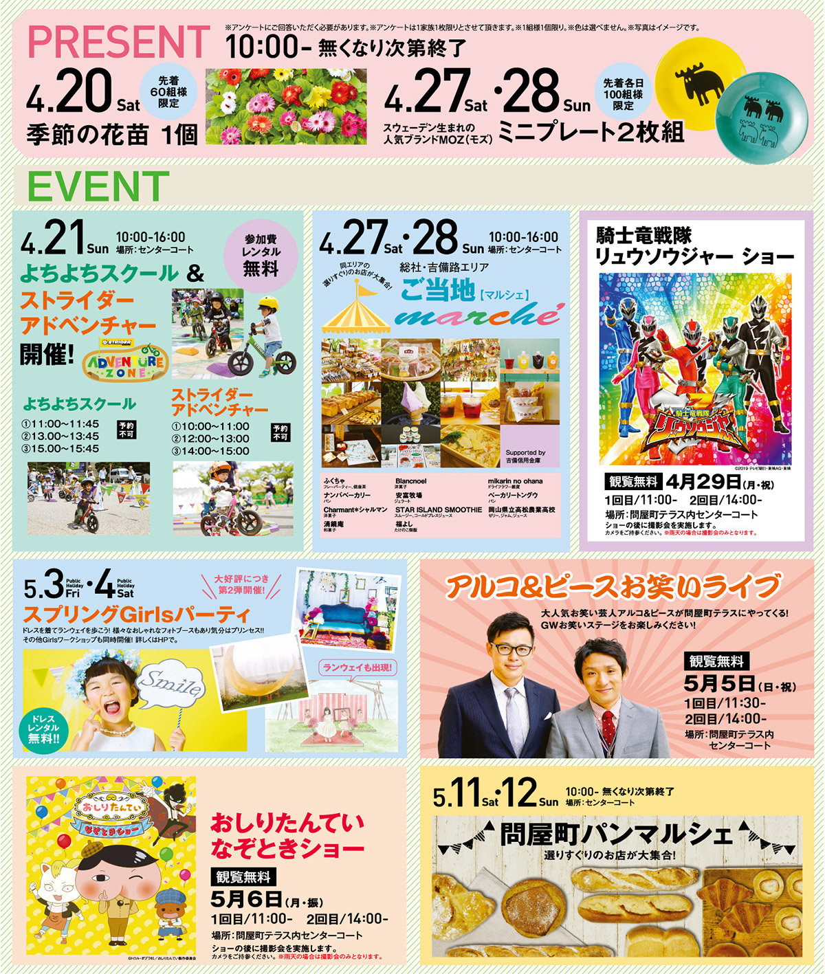問屋町テラス 「Golden Week Fair」4月20日(土)以降のプレゼント、イベント情報