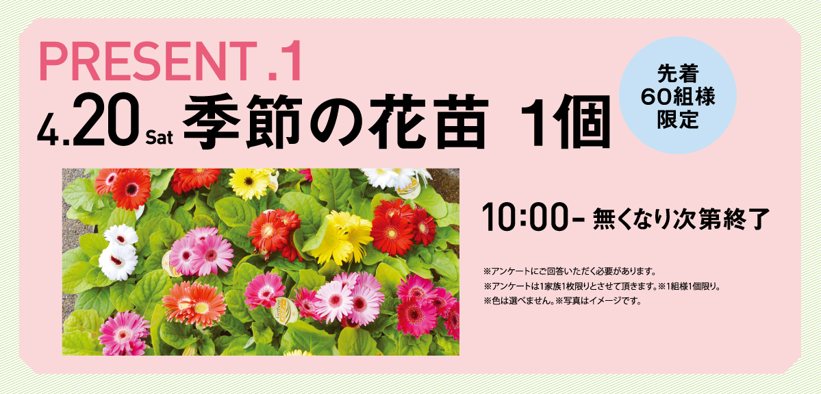 季節の花苗1個を先着60組様限定でプレゼントします。