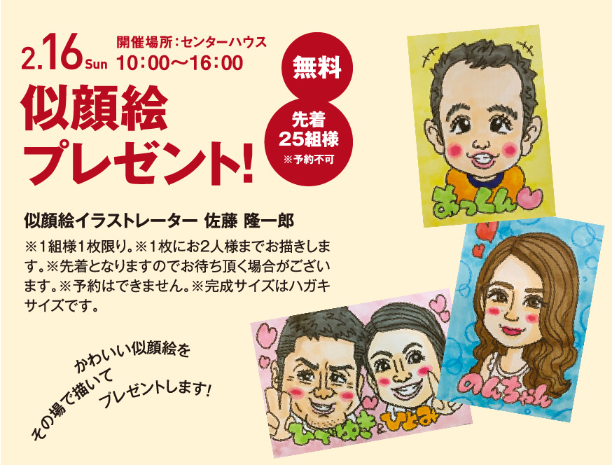 | プレゼント | 似顔絵プレゼント!無料! 似顔絵イラストレーター佐藤 隆一郎 かわいい似顔絵をその場で描いてプレゼントします! ※1組様1枚限り。 ※1枚にお2人様までお描きします。 ※先着となりますので、お持ち頂く場合がございます。 ※予約はできません。 ※完成サイズはハガキサイズです。 |